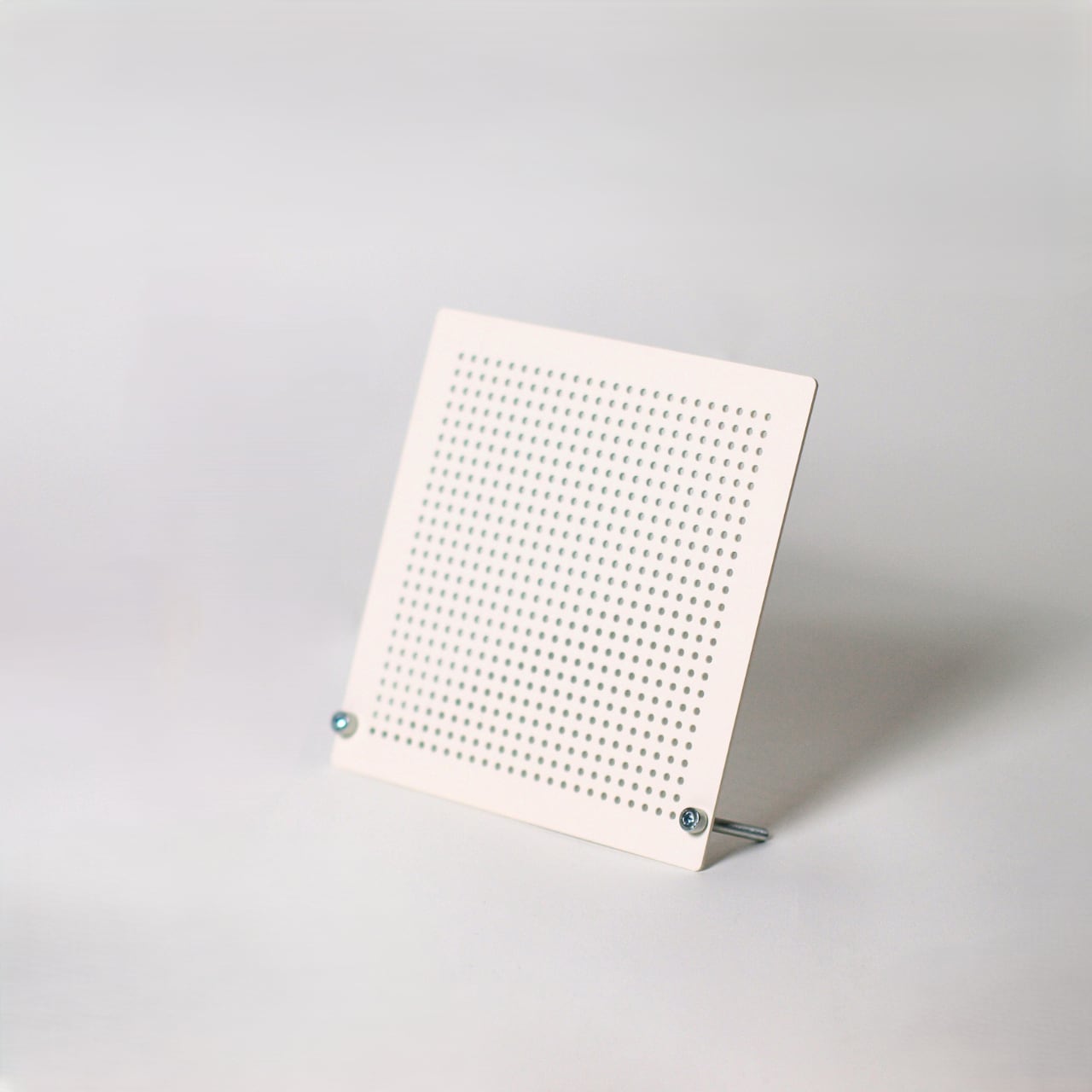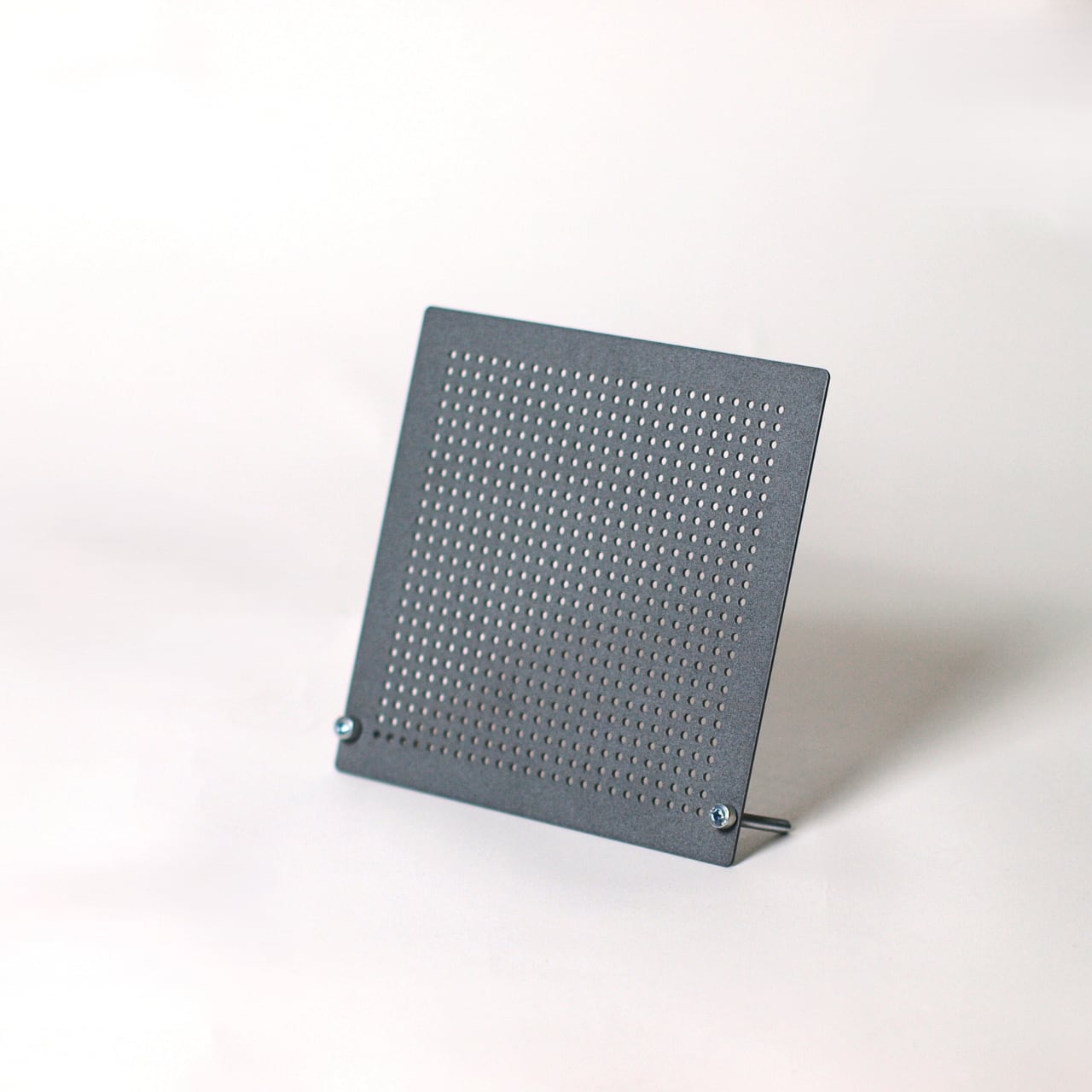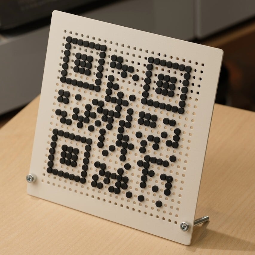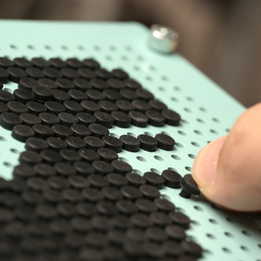 1粒ずつゴム製のドットを抜き差しすることで、自由に表示を変えることのできるドットマトリクスな看板の卓上サイズです。